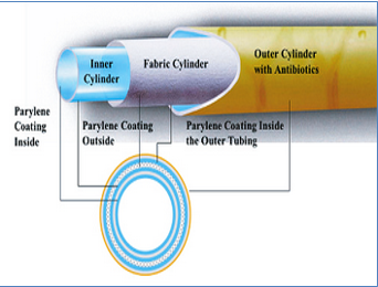 Первой отличительной особенностью нового устройства являются трехслойные цилиндры эндофаллопротеза. Внутренний цилиндр и внешний цилиндры изготовлены из силикона разных характеристик. Срединный цилиндр изготовлен из специального эластичного текстиля, что обеспечивает контролируемое увеличение составного цилиндра по диаметру, с 12 мм вплоть до 18 мм, а так же целостность геометрии цилиндров. Кроме того технология изготовления цилиндров включает еще одно усовершенствование - применение ультратонкого париленового покрытия снаружи и внутри внутреннего тканевого цилиндра, а так же на внешней поверхности внутреннего силиконового цилиндра и внутренней поверхности внешнего силиконового цилиндра. Париленовое покрытие значительно снижает трение между цилиндрами и обеспечивает наилучшую анатомичность изделия, снижает износ материалов и увеличивает срока службы эндофаллопротеза с 3,7 до 12,9 миллионов циклов применения (27).