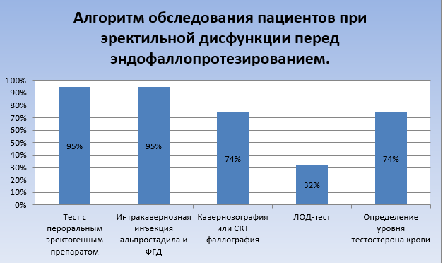 Самая большая группа пациентов из 19 мужчин - это пациенты с различными нарушениями сосудистых механизмов эрекции. Всем проведено комплексное урологическое обследование, которое включало тест с пероральным эректогенным препаратом (силденафил, тадалафил, варденафил), интракавернозный тест с альпростадилом с фармакофаллодопплерографией, кавернозография или СКТ фаллография с интракавернозным контрастированием и компьютерной реконструкцией, ЛОД-тест, определение уровня тестостерона крови.