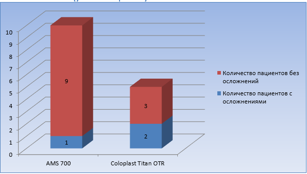 Ранние осложнения возникли у 3 из 15 пациентов, которым имплантировались надувные эндофаллопротезы. В одном случае из 10 при установке AMS 700 и в 2 случаях из 5 при установке Coloplast Titan OTR.