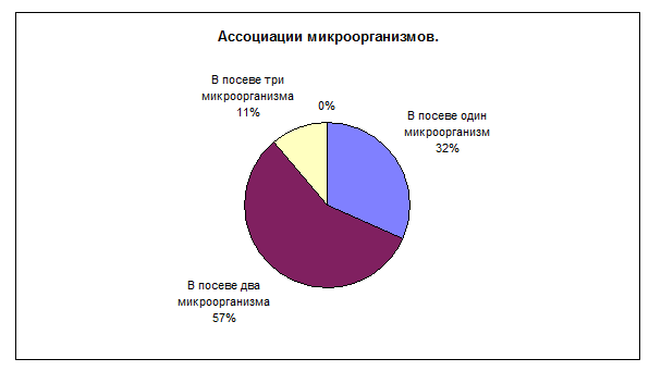 - В 68% случаев микроорганизмы высевались ассоциациями. Причем, чем выше степень ассоциации, тем чаще в ней определялся микроорганизм с гемолитической активностью.