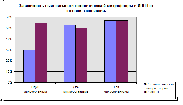 Таким образом видно, что в 68,2% случаев в бактериологическом исследовании секрета предстательной железы высеваются ассоциации микроорганизмов. Отметим, что у 46% обследованных ( те 29 пациентов из 63 ) в секрете предстательной железы выявлены микроорганизмы вызывающие гемолиз кровяного агара, причем чем выше степень ассоциации, тем чаще в ее структуре выявляется гемолитический микроорганизм. Более чем у половины пациентов выявляются ИППП , причем их выявляемость остается практически одинаковой при любой степени ассоциации.