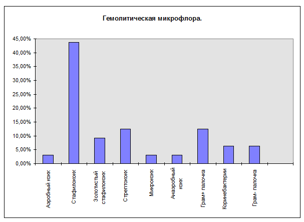 На представленной диаграмме видно, что преобладает выявляемость стафилококкой микрофлоры, что соответствует общему раскладу выявляемой микрофлоры. Втором место занимает Грам+ палочковая флора ( неидентифицированная Гр+ палочка и коринобактерии), на третьем месте стрептококк. Отдельно отметим, что определенная часть Грам- палочковой флоры также проявляет гемолитическую активность ( 12,5% от общего количества выявленных Грам- бактерий ).