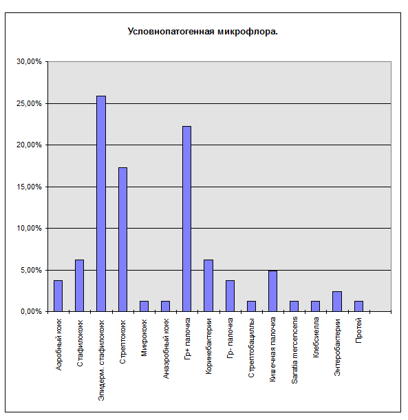 Все остальные микроорганизмы мы отнесли к условно-патогенной микрофлоре. Мы решили не выделять из данной группы микроорганизмы, которые можно рассматривать скорее как сапрофиты. По нашему мнению относить тот или иной микроорганизм в разряд сапрофитной микрофлоры необходимо индивидуально, учитывая все данные клинико-лабораторной диагностики.