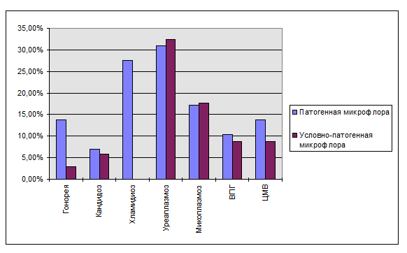 Дрожжевые клетки выявлялись при бактериоскопическом исследовании отделяемого из уретры или в бактериологическом исследовании секрета простаты с идентификацией до вида. Хламидиоз идентифицировался при исследовании соскоба из уретры методом PCR или ПИФ или при наличии иммуноглобулинов класса М к инфекции. Уреаплазмоз и микоплазмоз идентифицировался при исследовании соскоба из уретры методом PCR. ВПГ и ЦМВ идентифицировались при исследовании соскоба из уретры методом PCR или при наличии иммуногобулинов класса М к инфекции.