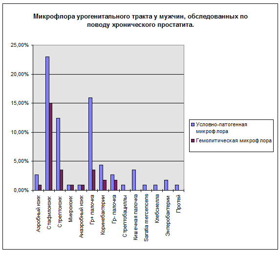 - У всех пациентов, обследованных по поводу хронического простатита при отсутствии клинико-лабораторных данных острого или хронического уретрита, при бактериологическом исследовании секрета предстательной железы выявлена неспецифическая бактериальная микрофлора. У 46% пациентов ( у 29 из 63 человек ) выявлена патогенная ( гемолитическая ) микрофлора.