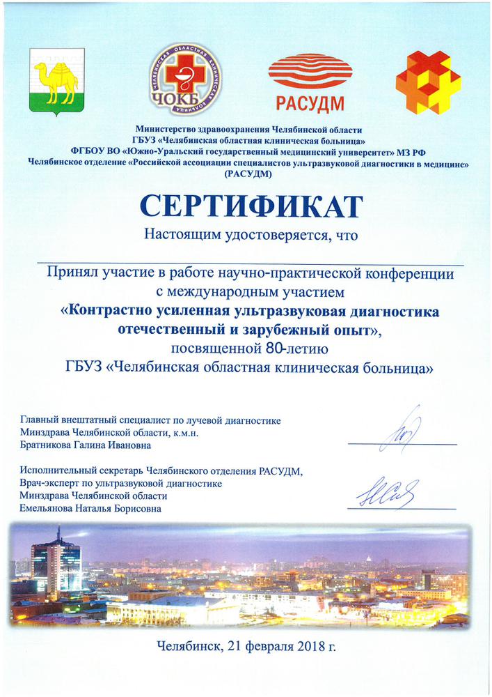 Сертификат "Контрастно-усиленная ультразвуковая диагностика отечественный и зарубежный опыт"